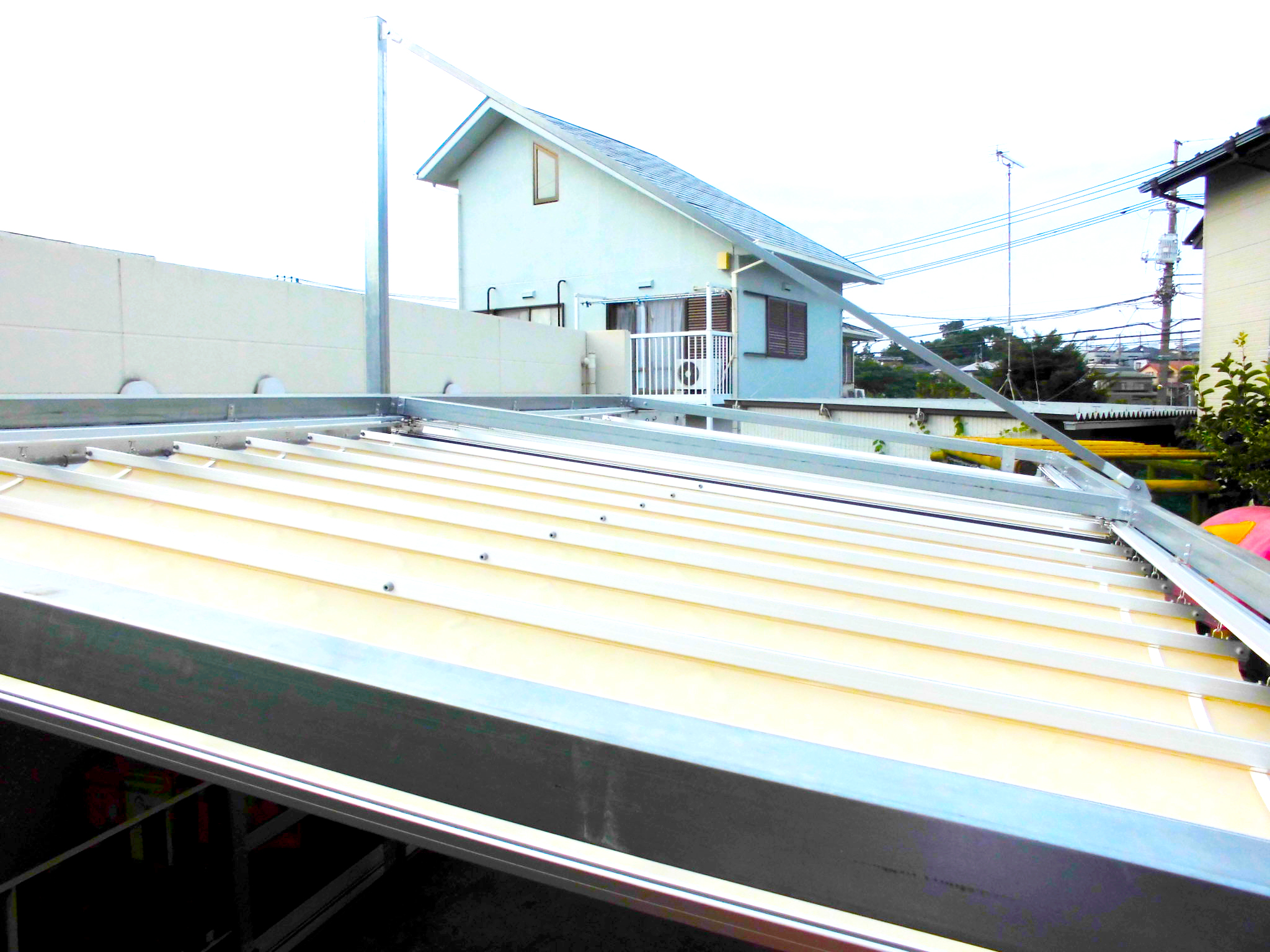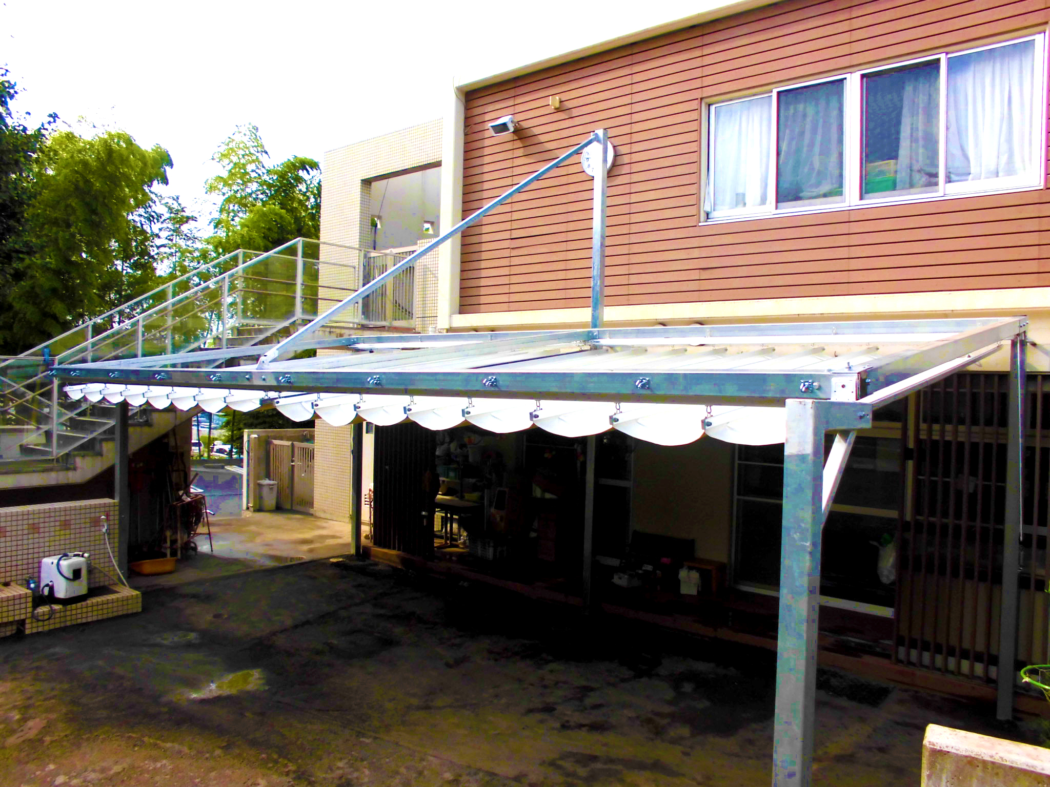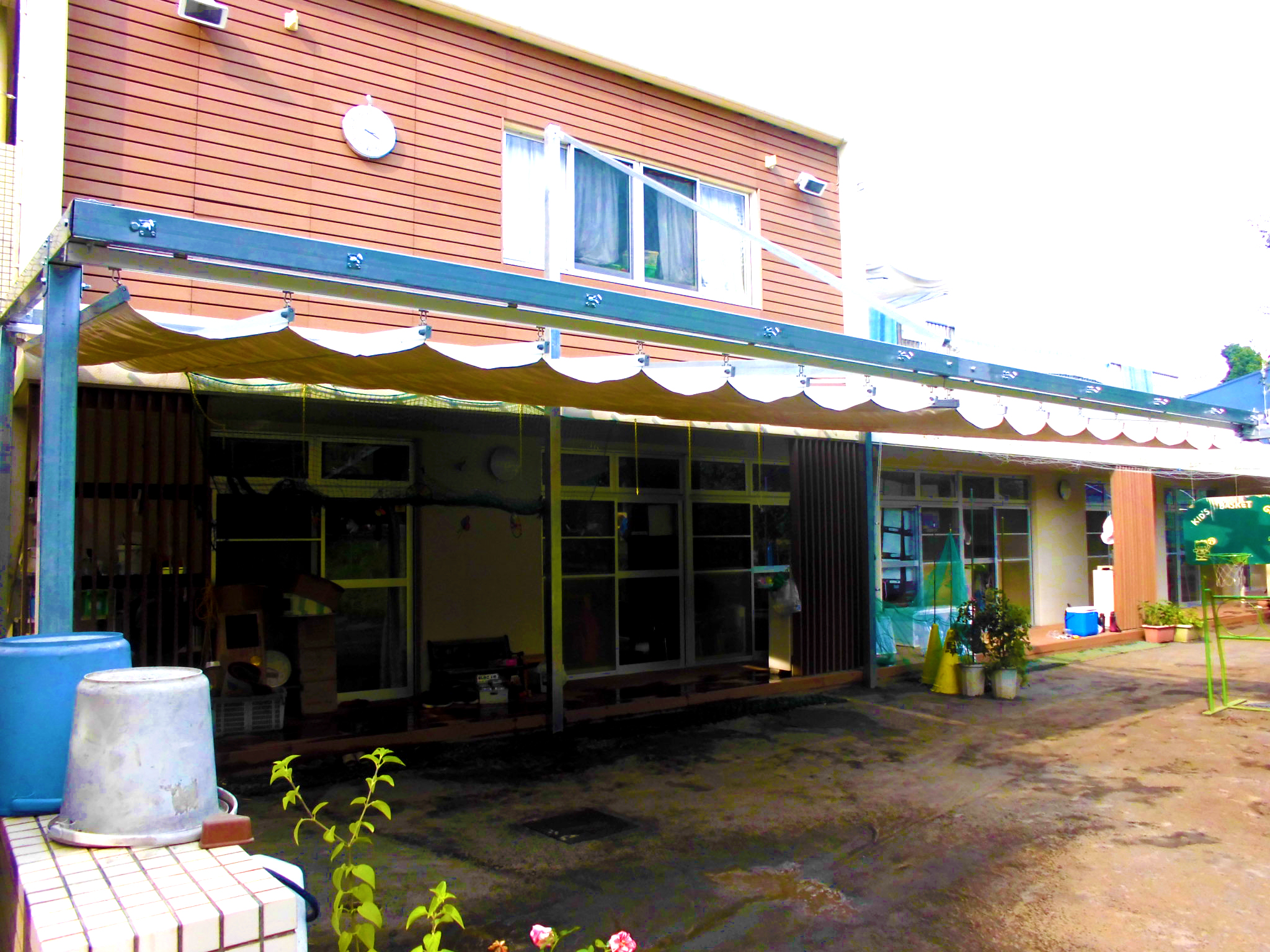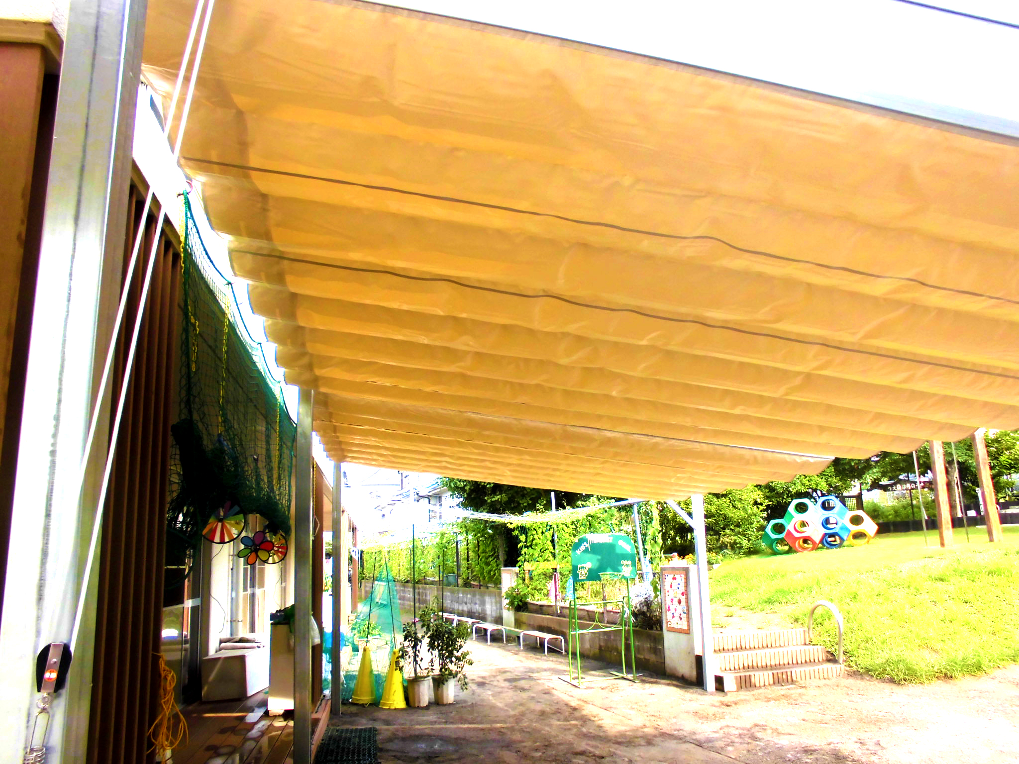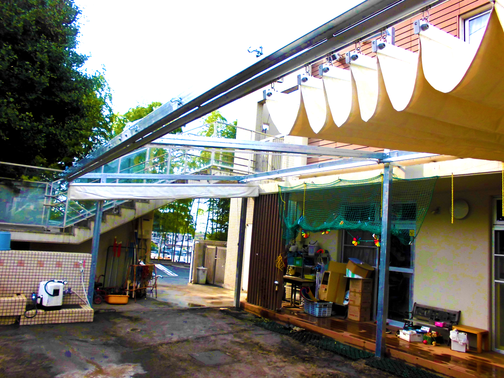 社会福祉法人 虹の会 上の原保育園様 PART1 テント製作・設置工事/保育園 上の原保育園様。まず、こちらはスライド式テント工事です。 雨除けも兼ねています。 お気軽にお問い合わせください メールフォームはこちら
