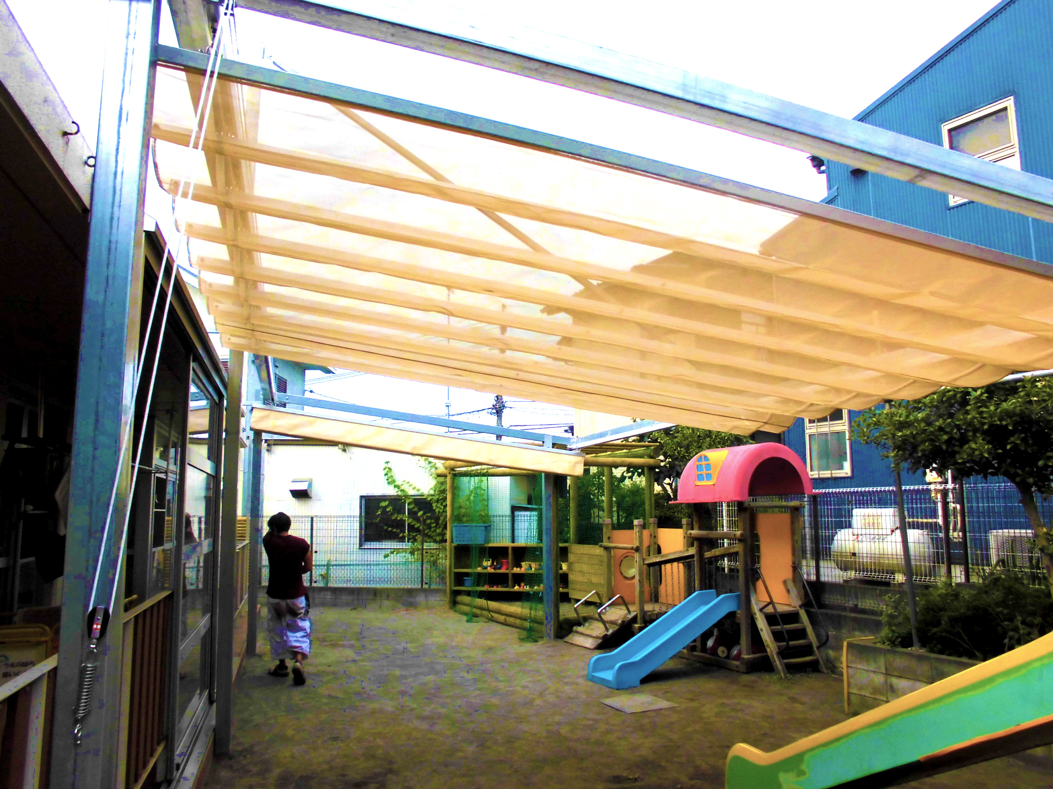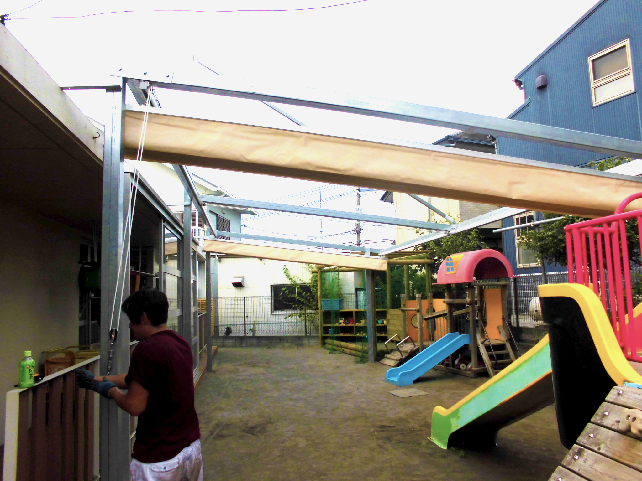 こちらは、スライド式メッシュタイプのテント製作・設置工事です。